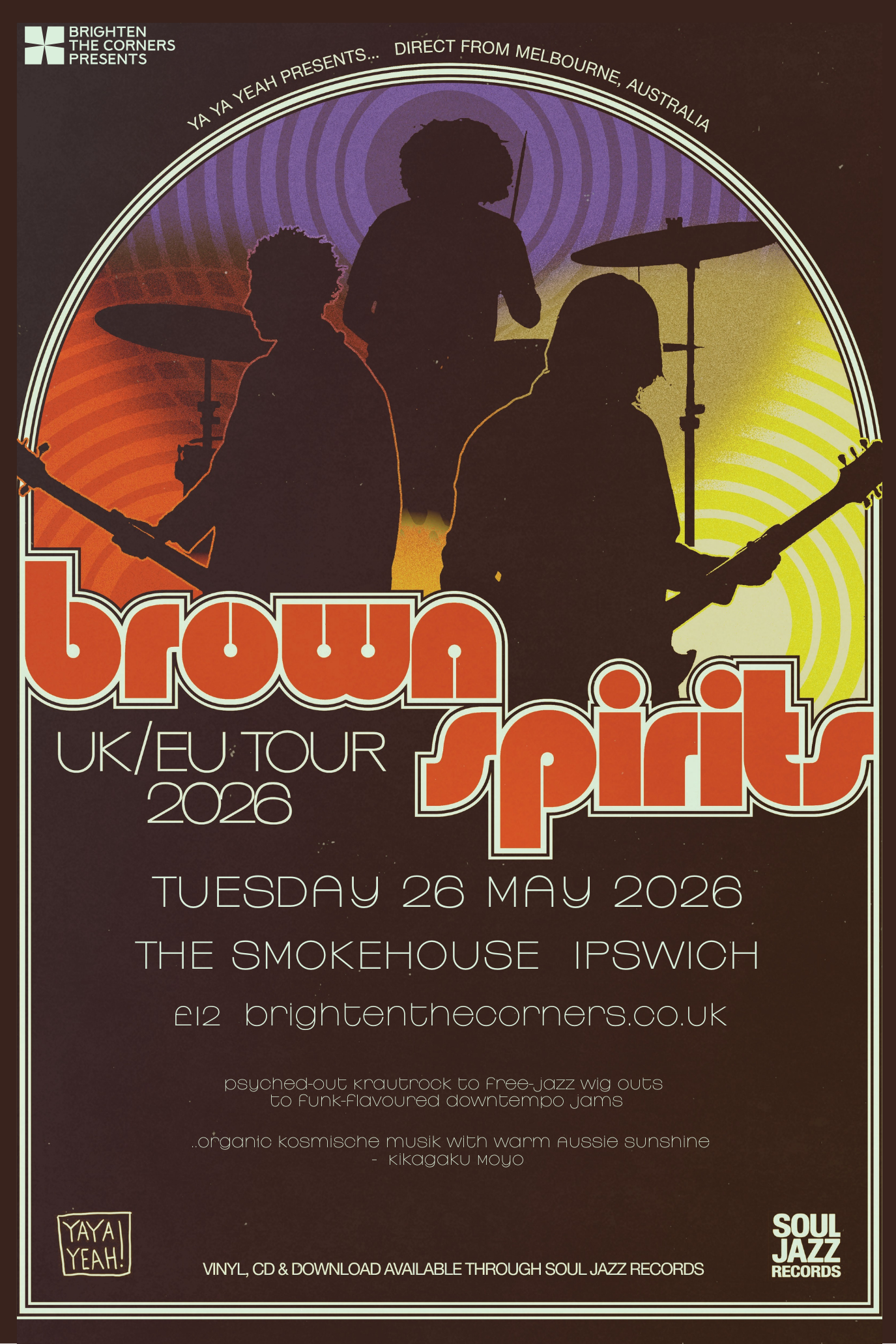 Brighten The Corners Presents Soul Jazz Records’ Melbourne psych trio Brown Spirits at The Smokehouse on Tuesday 26th May.
