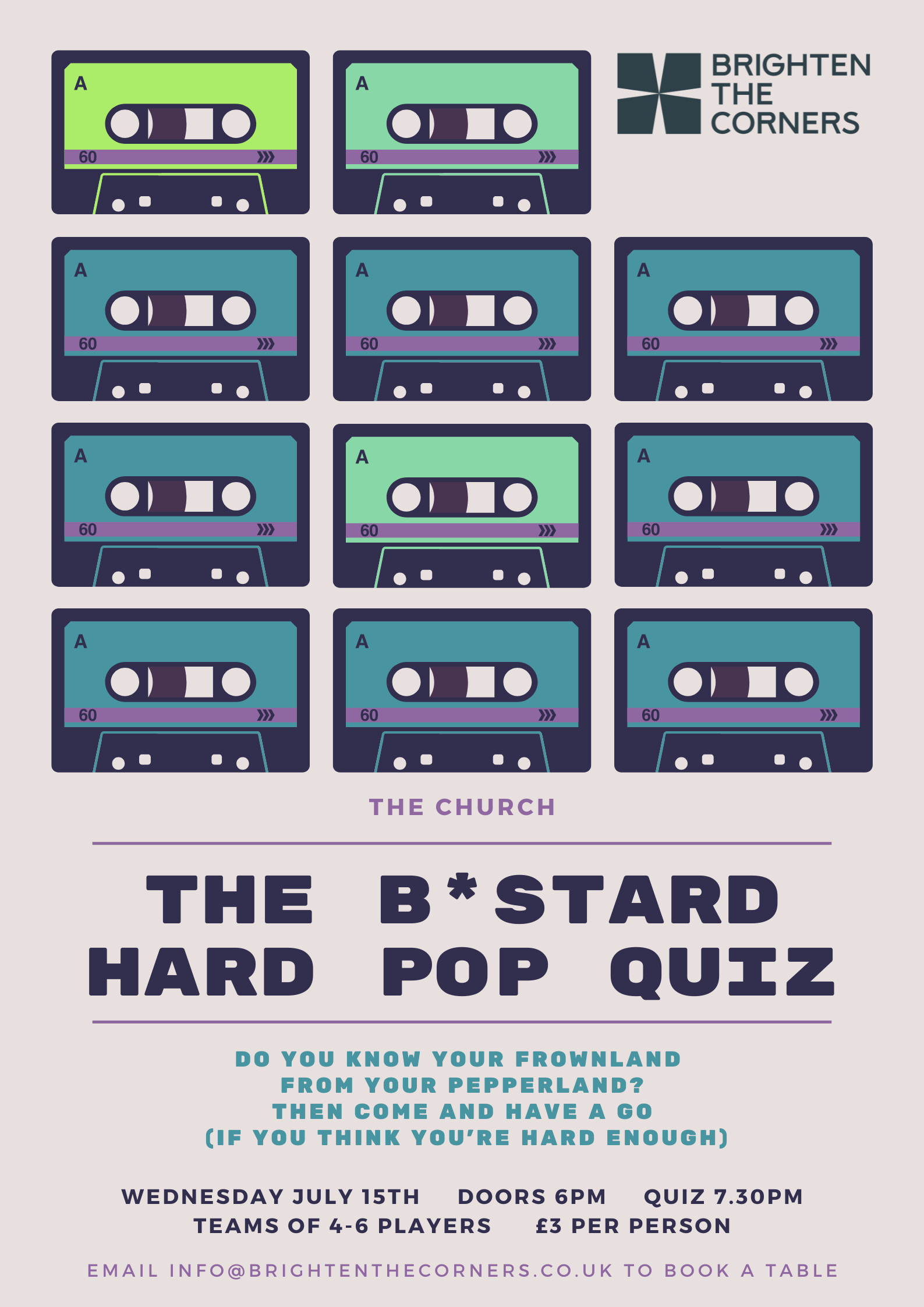 Please email us at info@brightenthecorners.co.uk to book a table stating how many people on the table.